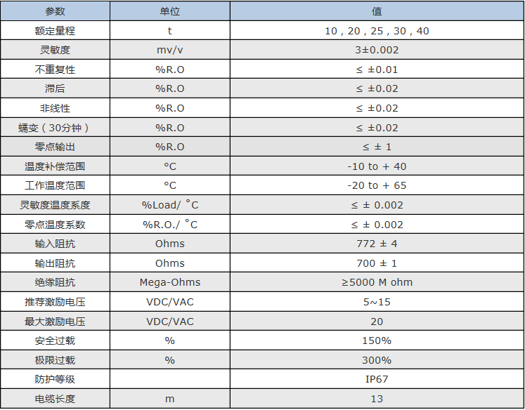 SBD-40t 型號說明:雙剪切梁式傳感器,容量40t,13M電纜