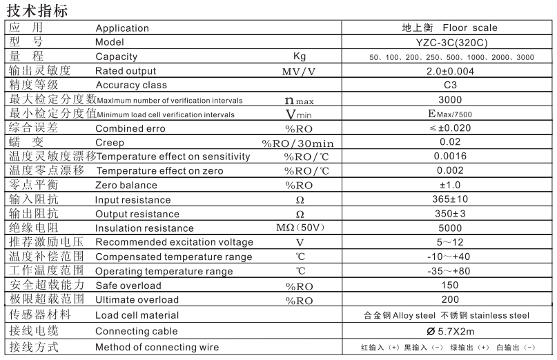 廣州電測傳感器YZC-320C系列產(chǎn)品參數(shù):