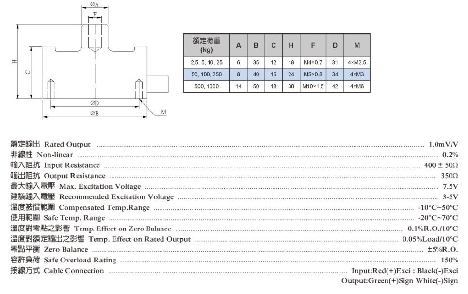 MLT荷重元係高精度,拉壓雙向力量感測器,使用應(yīng)變規(guī)為感測元件,變形 量小,精度高;所有感測電路均藏於金屬彈性體內(nèi),完全密封保護,不受外界干 擾,穩(wěn)定性高;具以下之特點: 拉壓雙向 剛性強 溫度補償 整體密封保護