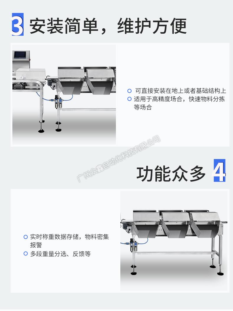 皮帶式重量分選秤主要應(yīng)用于產(chǎn)品的自動(dòng)稱重分級(jí),即按照產(chǎn)品設(shè)定的重量大小規(guī)格分選等級(jí),將每個(gè)產(chǎn)品單獨(dú)稱重并自動(dòng)分選到指定的重量等級(jí)或類別,高效取代人工分揀,提高產(chǎn)品的標(biāo)準(zhǔn)化程度和分揀速度,降低人工操作的失誤。廣泛應(yīng)用于水產(chǎn)、禽肉、藥材、五金、原材料、物流、化工塑膠產(chǎn)品等多個(gè)行業(yè)。