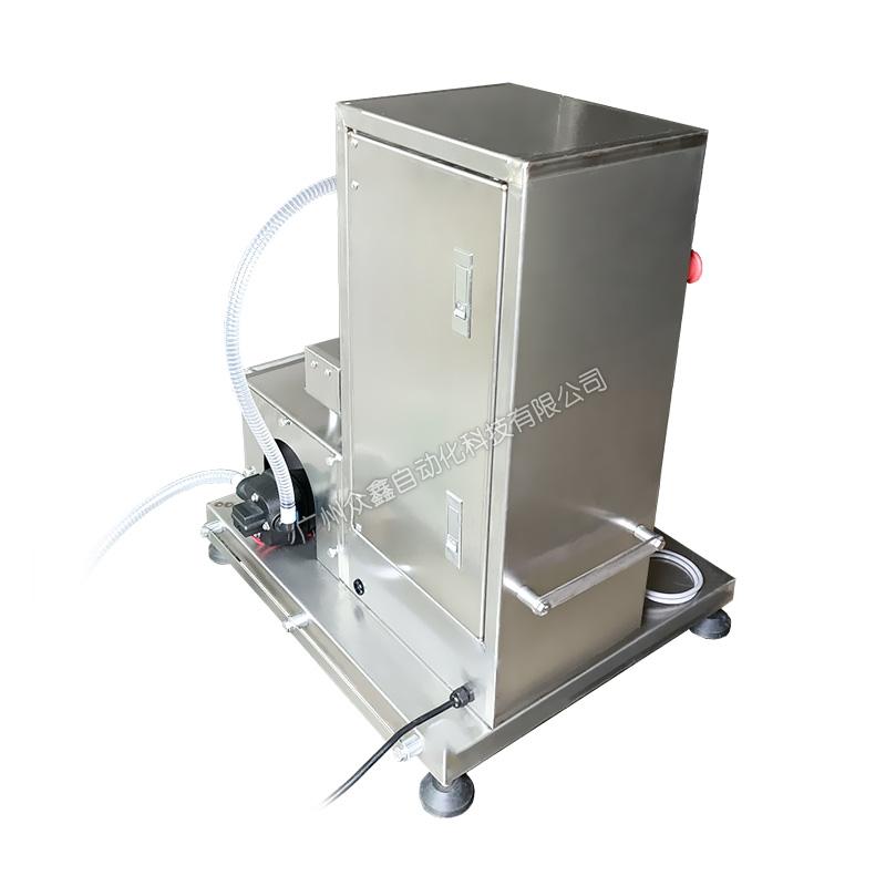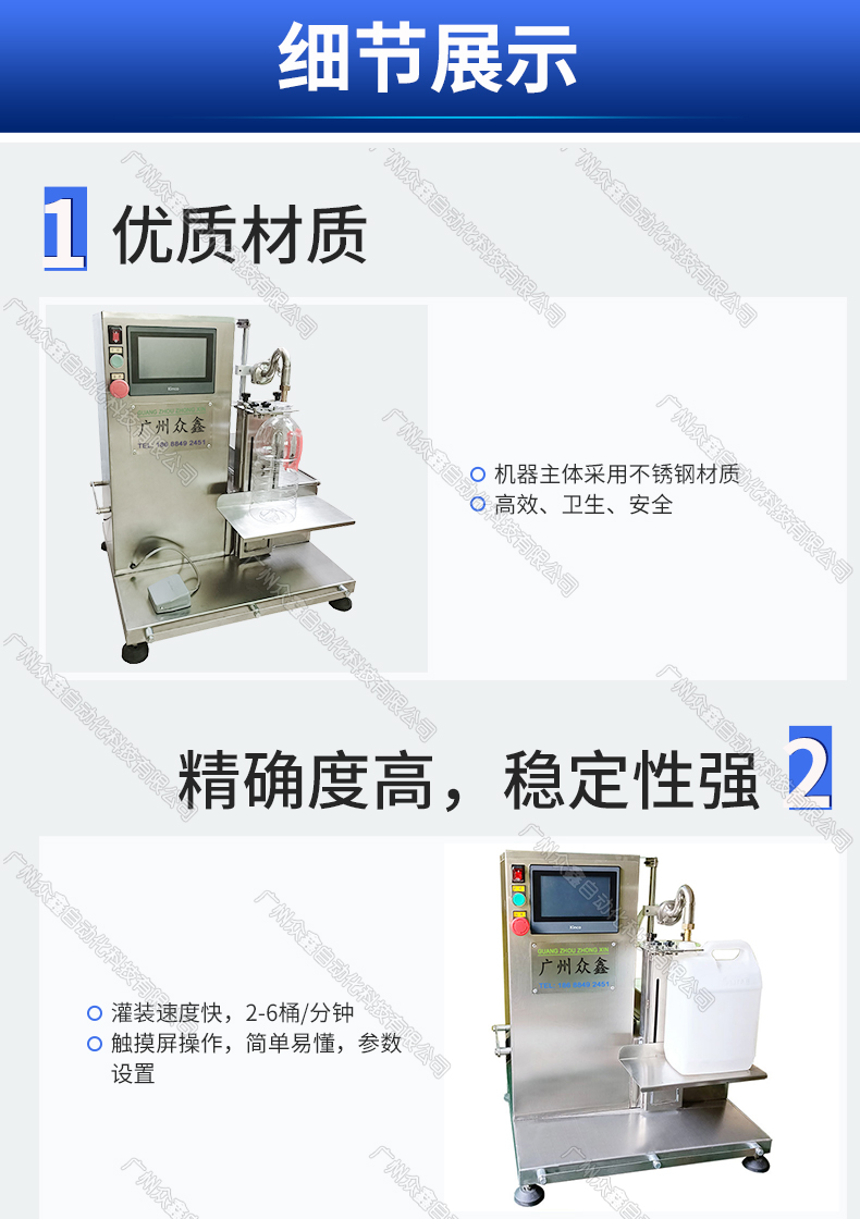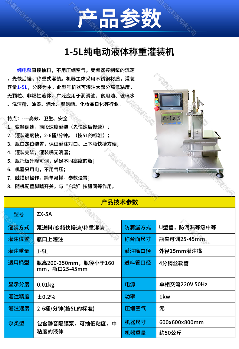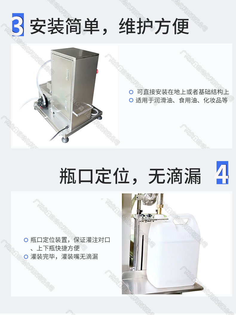 純電泵直接抽料,不用壓縮空氣,變頻器控制泵的流速、先快后慢,稱重式灌裝。機(jī)器主體采用不銹鋼材質(zhì),灌裝容量1-5L,分裝為主。此型號(hào)機(jī)器可灌注大部分高低粘度,無顆粒、非爆性液體,廣泛應(yīng)用于潤滑油、食用油、玻璃水、洗潔精、油墨、酒水、聚氨酯、化妝品日化等行業(yè)。
