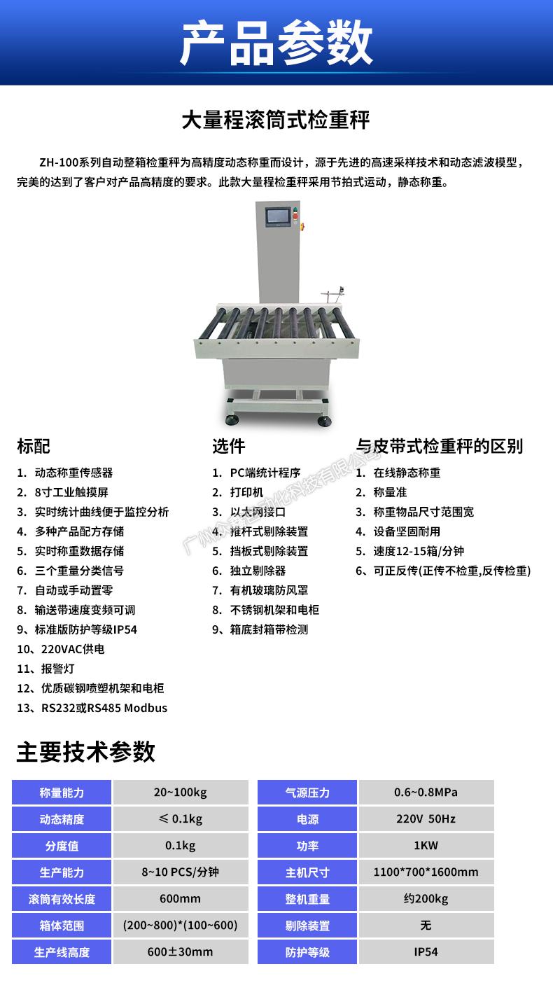 ZH-100系列自動(dòng)整箱檢重秤為高精度動(dòng)態(tài)稱重而設(shè)計(jì),源于先進(jìn)的高速采樣技術(shù)和動(dòng)態(tài)濾波模型,完美的達(dá)到了客戶對(duì)產(chǎn)品高精度的要求。此款大量程檢重秤采用節(jié)拍式運(yùn)動(dòng),靜態(tài)稱重。