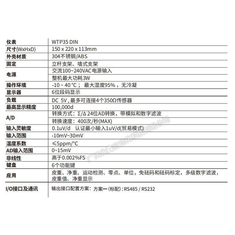 三、WTP35 DIN過程稱重顯示控制器技術參數(shù)