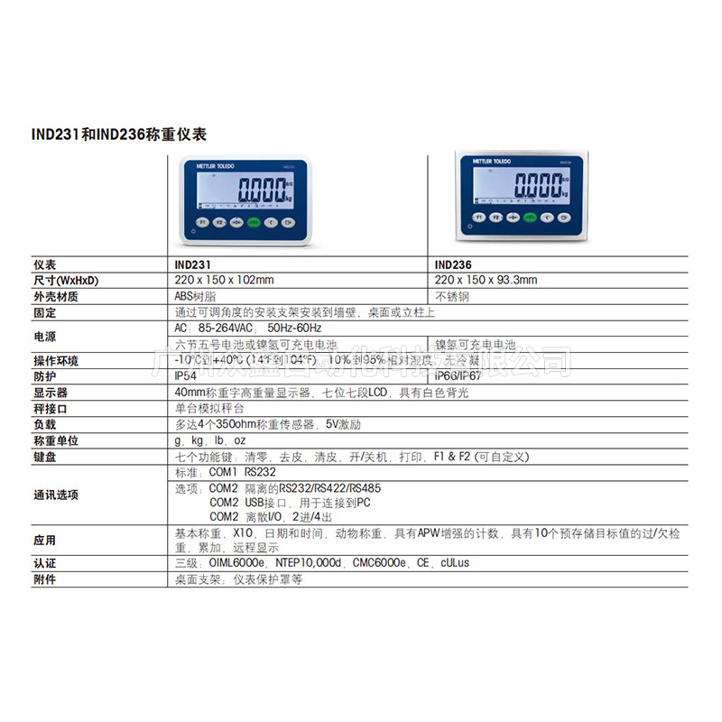 六、梅特勒托利多 IND236稱重儀表技術指標