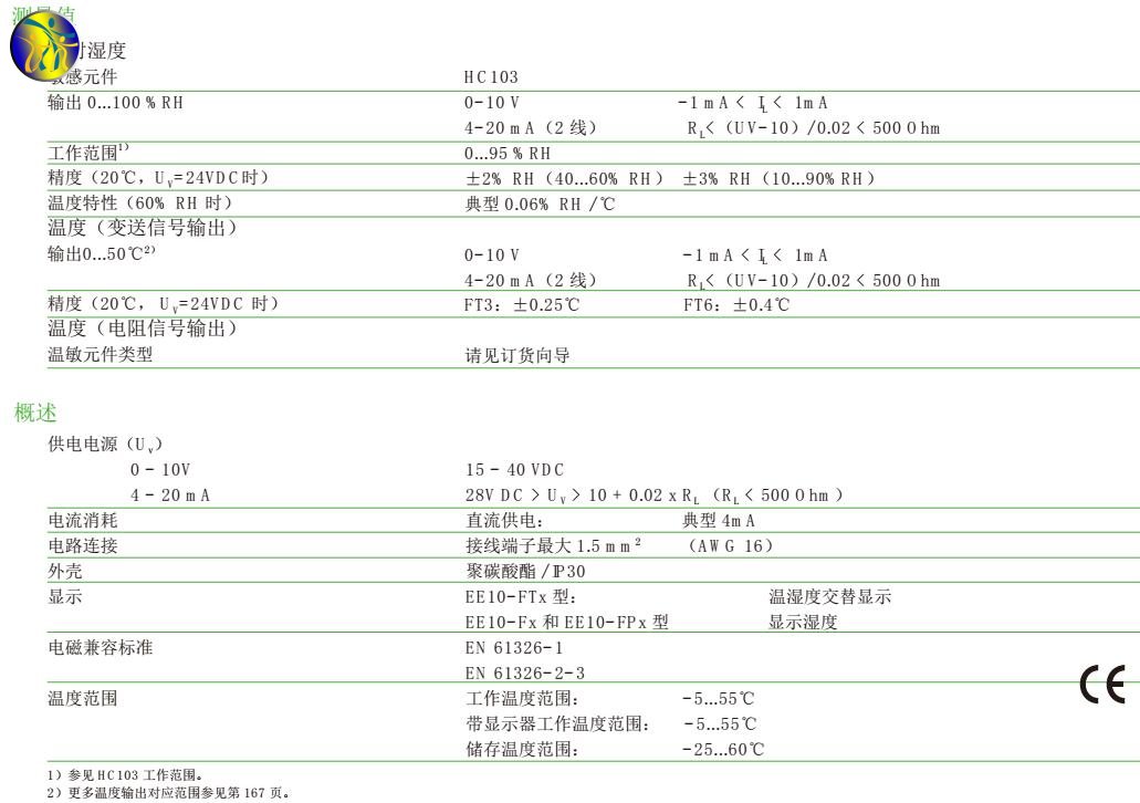 奧地利E+E EE10系列溫濕度傳感器技術(shù)參數(shù)