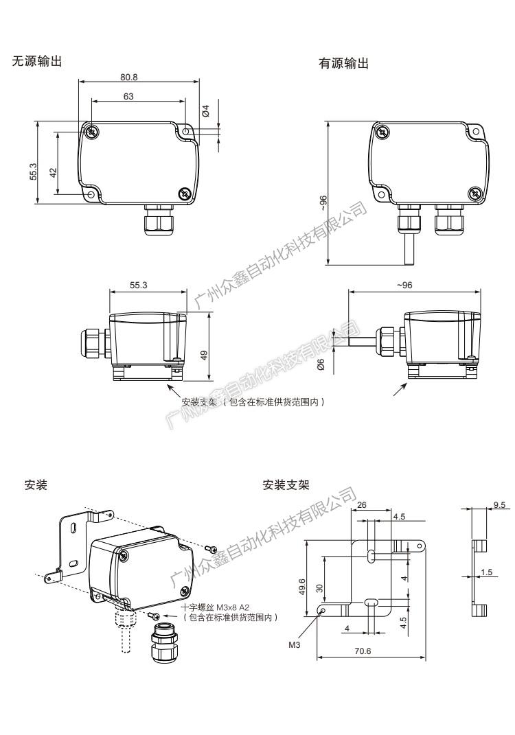 變送器創(chuàng)新的殼體能滿足IP65防護等級要求,同時方便用戶現(xiàn)場安裝。另外,外殼上的安裝支架能讓變送器與墻面保持一定的距離,避免墻體溫度對測量造成影響,使環(huán)境溫度的測量結(jié)果更加精確。